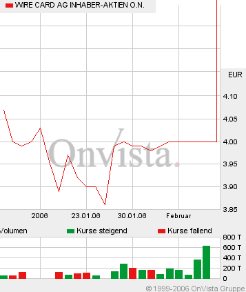 .....Gut unterwegs ist auch der Anbieter von Bezahldiensten im Internet, Wire Card. Daß man bei unserem Musterdepot-Wert Geduld braucht, wurde in den vergangenen Wochen deutlich. Schon mehrmals ist die Aktie an der Marke von 4 Euro abgeprallt. Jetzt endlich hat es geklappt. Angeblich ist eine Verkaufsorder über mehrere Millionen Papiere ausgelaufen.