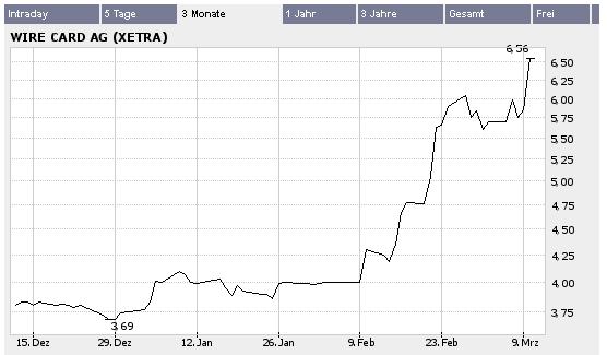 Die optimistischen Erwartungen kamen auch im Chart zum Ausdruck. Wer Ende August beherzt zugriff (Wire Card-Aktie mit guten Aussichten), kann heute auf einen Kursgewinn von fast 100 Prozent zurückblicken, obgleich das Papier seit dem Vier-Jahres-Hoch vom Montag vergangenen Woche bei 6,79 Euro etwas zurückgekommen ist.