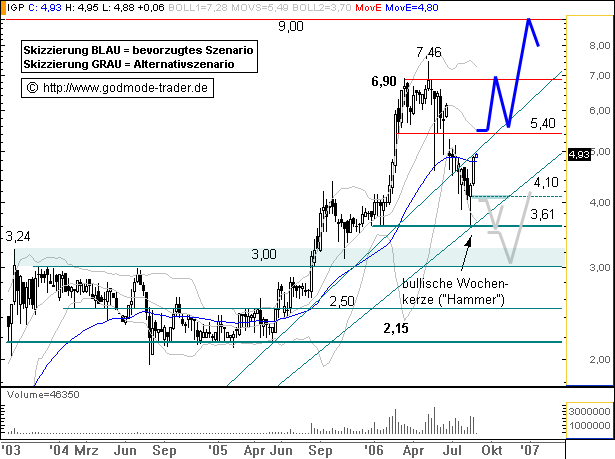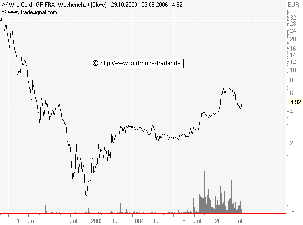 Rückblick: Die WIRE CARD Aktie befindet sich in einer langfristigen Aufwärtsbewegung. Im September 2003 markierte sie dabei ein Zwischenhoch bei 3,24 Euro und schwenkte in eine lange Seitwärtsbewegung zwischen 2,15 und 3,00 $ an. Diese wurde im August 2005 nach oben hin aufgelöst und ließ die Aktie in einer steilen Kursrallye bis auf 6,90 Euro im März 2006 ansteigen. Ein Ausbruchsversuch über 6,90 Euro nach einer Zwischenkorrektur scheiterte im Mai, woraufhin eine Abwärtskorrektur gestartet wurde. Diese erreichte den Unterstützungsbereich bei 3,00 - 3,24 Euro nicht, die Aktie drehte bereits an der Horizontalunterstützung bei 3,61 Euro wieder deutlich nach oben. Dabei wurde eine bullische Wochenkerze in Form eines "Hammers" als potenzielle Trendwendekerze hinterlassen. Aktuell erreicht die Aktie den Widerstandsbereich der GLD bei 4,80 - 4,87 Euro. Das kurzfristige Chartbild ist neutral zu werten.