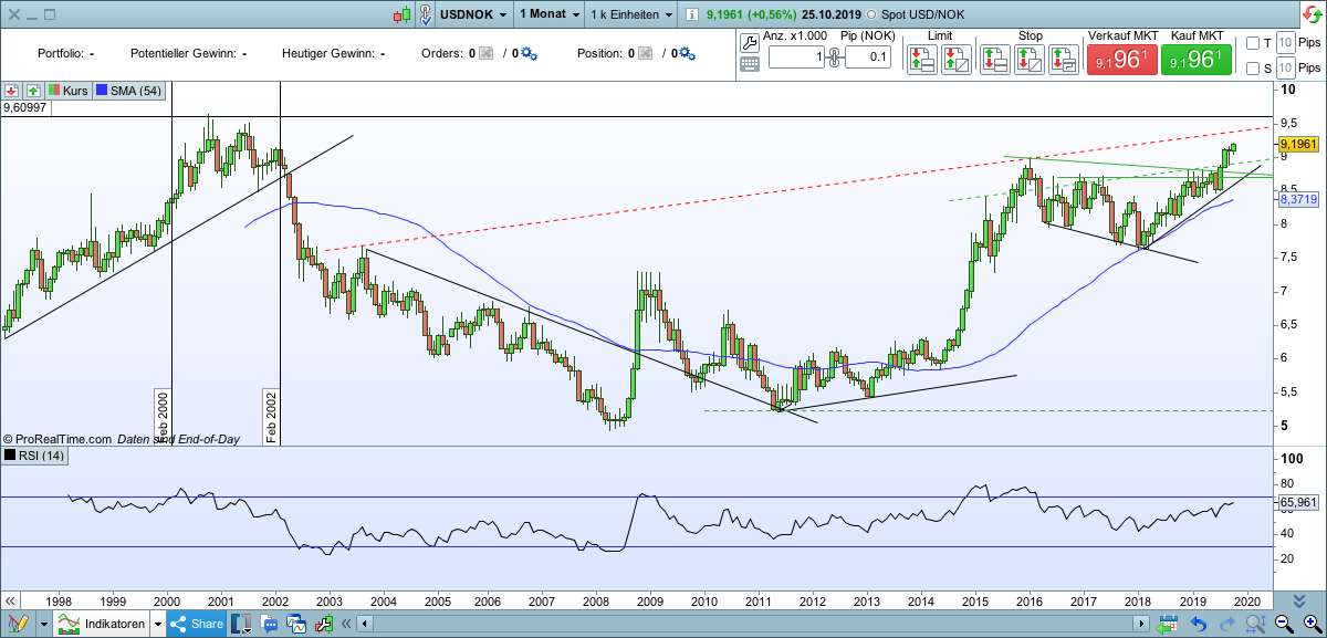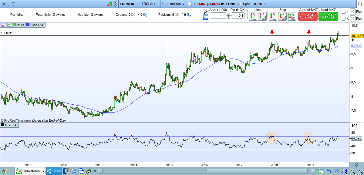 Dafür bin ich gestern EUR/NOK short gegangen. Entscheidend war für mich die Wochenkerze und die Indikatorenlage. Ziel ist die SMA.