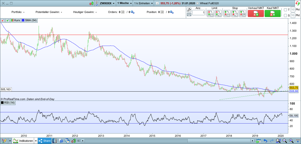 Die Soft Commodities fristen schon lange ein Schattendasein wie zB. Weizen. Das könnte sich ändern, sollte der Klimawandel extremere Wettersituationen ausbildet. Aktuell ist der Abwärtstrend abgeflacht und lässt eine Bodenbildung erkennen.