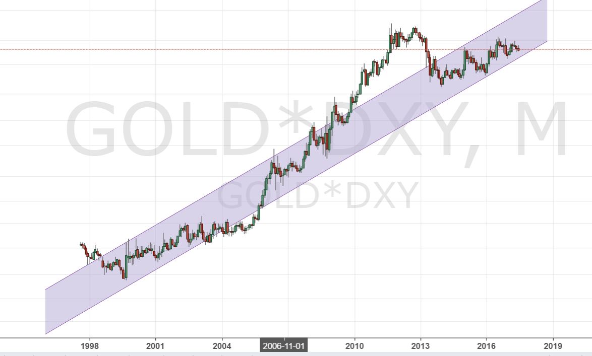 Habe mal einen Chart beigefügt - GOLD* USD Index Monatskerzen. Eigentlich war meine Erwartung, dass der langfristige exponentielle Aufwärtstrend erhalten bleibt. Jetzt mache ich mir Sorgen, dass er nach unten ausbricht.