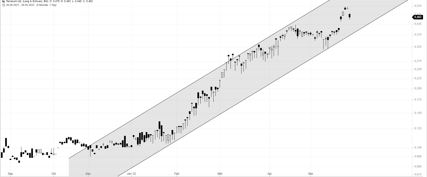Ansonsten sieht es mit Terracom echt gut aus. Der Aufwärtstrend ist intakt. Die Firma verdient Geld und ist im Zukunftsmarkt Kohle unterwegs. Schwungvoll über die 42 Ct ausgebrochen und kommt jetzt aufs Ausbruchsniveau zurück. Da kann man einsteigen.