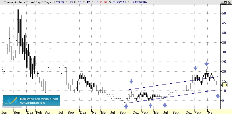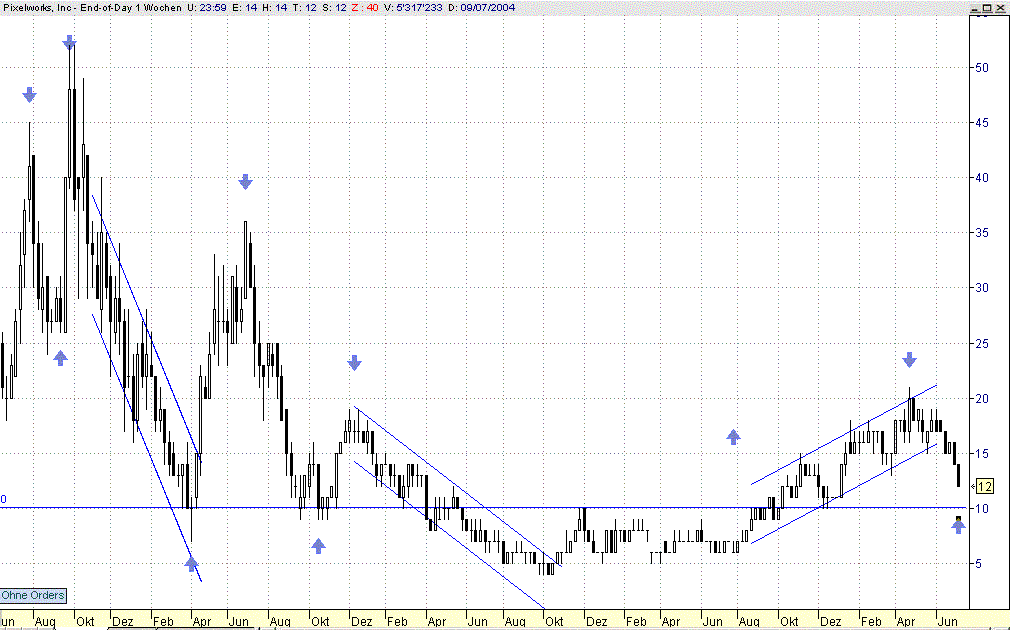daß es nächste Woche eine Gegenbewegung geben wird so bis an die 14 USD oder knapp darüber, allerdings wird diese nur von kurzer Zeit sein. PXLW wird sicher noch etwas abkühlen ´, denn momentan liegt sie in einem Abwärtstrendkanal der bis an die USD 10.--geh´t. Hier ist wie in Posting 5 eine wichtige Unterstütung. Wenn die hält geht´s erstmal wieder nach oben. Du mußt bedenken die hatt von Oktober 2002 bis April 2004 unglaubliche 500% gemacht. Ganz klar dass es hier mal nach unten geh´t. Tut der Aktie aber sicher mal ganz gut.