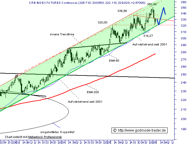 Der CRB Index konnte im August 2005 ein Rallyhoch bei 336,56 Punkten absolvieren. Ausgehend davon mündete der Index in eine moderate Korrekturphase, die ihn auf den wichtigen Aufwärtstrend seit 2001 führte. Der Aussagekraft des Aufwärtstrends wird bereits seit Monaten durch den exp. GDL (EMA200/rot) verstärkt. Das Resultat ist ein dynamischer Kursanstieg, der ausgehend vom beschriebenen Kurslevel von uns auch so erwartet wurde und mit einem neuen Rallyehoch bei 350,96 Punkten eine weitere Etablierung des Trends bewirkt. Die wichtige zentrale Unterstützung bei 320,00 Punkten konnte als unser Konsolidierungsziel erreicht werden. Eine horizontale Unterstützung, der exp. GDL (EMA50/blau) und der Aufwärtstrend seit 2001 stellen die wesentlichen Elemente dar. Sollte die Konsolidierung im Bereich der Aufwärtstrendlinie seit 2001 beendet sein, dürften wieder Kurserholungen bis zum Jahreshoch bei 350,96 Punkten und darüber anstehen. Der Index sollte in diesem Bereich engmaschiger verfolgt werden.