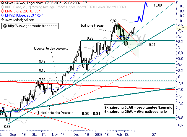 Diagnose: SILBER befindet sich seit Ende August 2005 in einer steilen Aufwärtsbewegung. Ende Januar markierte das Edelmetall dabei ein Mehrjahreshoch bei 9,92 $ und startete eine Korrekturbewegung in Form einer bullischen Flagge als Fortsetzungsformation im Aufwärtstrend. Dabei rutschte SILBER auch kurzzeitig unter den steilen Aufwärtstrend seit November und die Horizontalunterstützung bei 9,23 $, konnte aber angesichts der übergeordneten Trendstärke sofort wieder nach oben anziehen. In der vergangenen Woche gelang schließlich der Bruch der Oberkante der Bullenflagge bei 9,49 $. Nach anschließender Seitwärtskorrektur oberhalb der exp. GDL 50 (EMA50) sprang das Edelmetall Ende letzter Woche wieder deutlich nach oben und setzt die Aufwärtsbewegung in Richtung Jahreshoch bei 9,92 $ weiter fort.