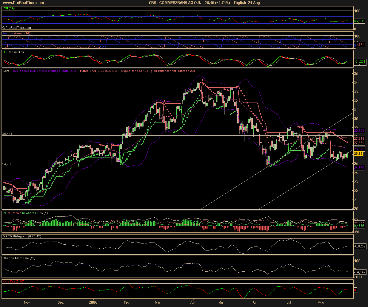 Bankenlandschaft wieder entfacht und damit ist die Commerzbank als eine der Übernahmekandidatinen für viele Investoren und Spekulanten wieder ins Rampenlicht gerückt. Also aufmerksam die Kursentwicklung der nächsten Wochen beobachten. Bei positivem Börsenumfeld könnte die Commerzbank auf 2 Monatsfrist wieder bei 30 € notieren.