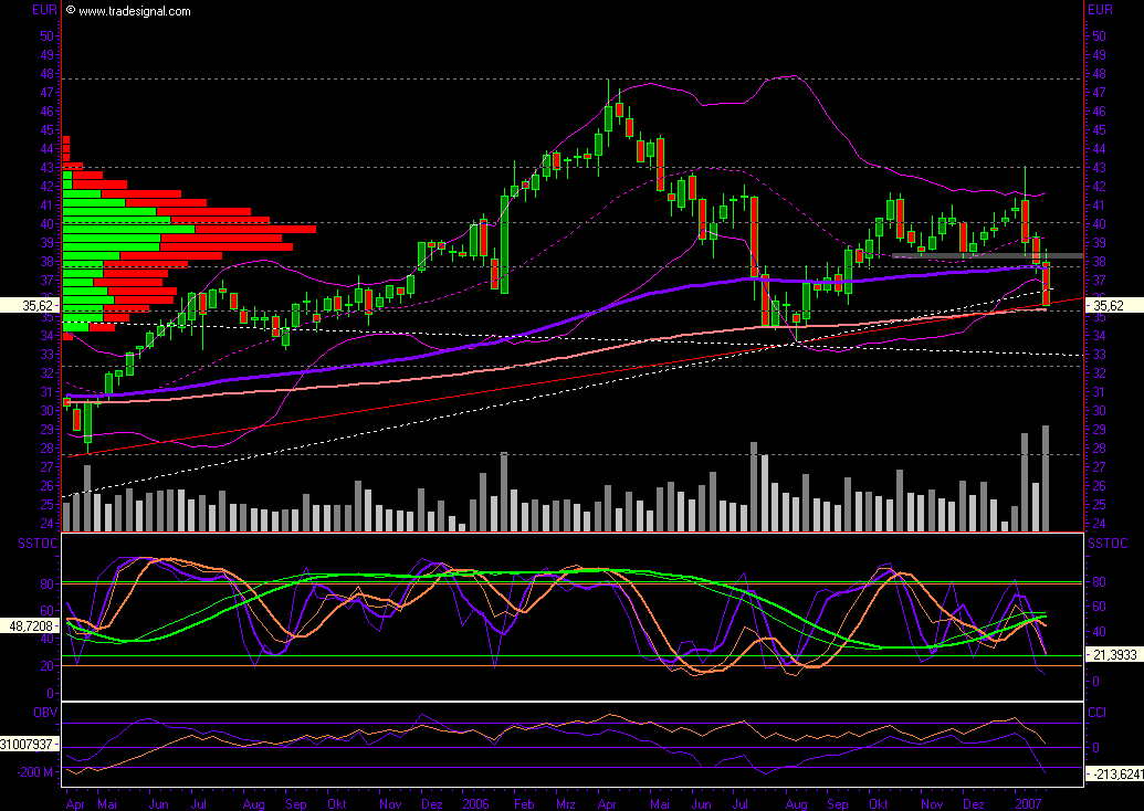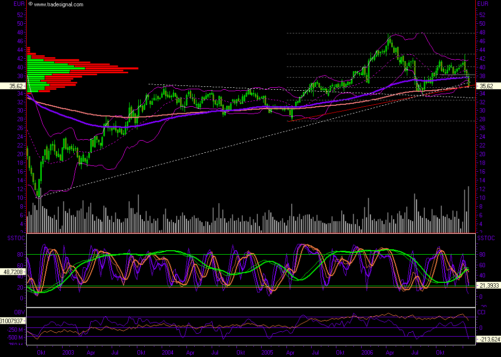 brenzlig die Lage derzeit ist, hier der längere Chart, alle Trends sind gebrochen, außer dem seit Allzeittief, aber der verläuft aktuell ca. bei 14, sie befinder sich derzeit unmittelbar auf dem 200er GD im Wochenchart, bricht der, ist das Ziel 34, bricht dieser horizontale Widerstand auch noch, so ist das nächste Ziel um 30 und tiefer