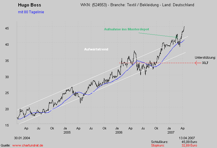 Die Hugo Boss Aktie bewegte sich in einem langfristigen intakten Aufwärtstrendkanal, den die Aktie im April 2007 sogar nach oben verlassen hat. Mit dieser Aufwärtsbewegung kann sich die Hugo Boss Aktie aber in eine Übertreibungsphase hineinbewegen, bei der dann mit Kursrückschlägen zu rechnen ist. Deswegen sollten die Aktien-Positionen nur unter Beachtung der Indikatorenanalyse aufgebaut werden, da hierbei auch die Übertreibungsphasen berücksichtigt werden.