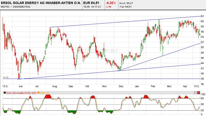 bildet Ersol heute das Schlusslicht im TecDax. Hatte nach dem Trend in den USA auf eine Überwindung der 60er Widerstandslinie gehofft, denn dann ist Luft nach oben.