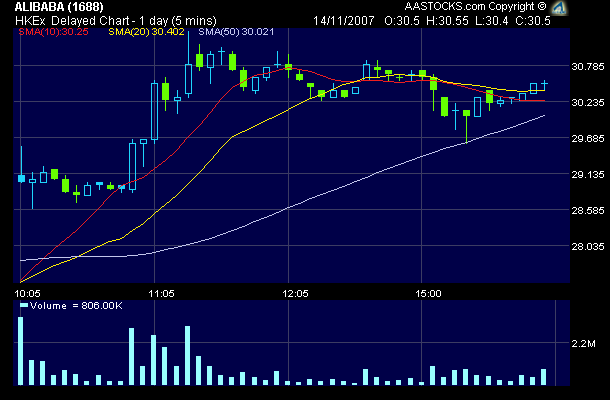 Alibaba.com (1688.HK) bounces 11.9% to HK$30.50 on heavy volume, after correcting 33% to HK$27.10 low vs post-listing high of HK$40.50 (hit Nov. 7).