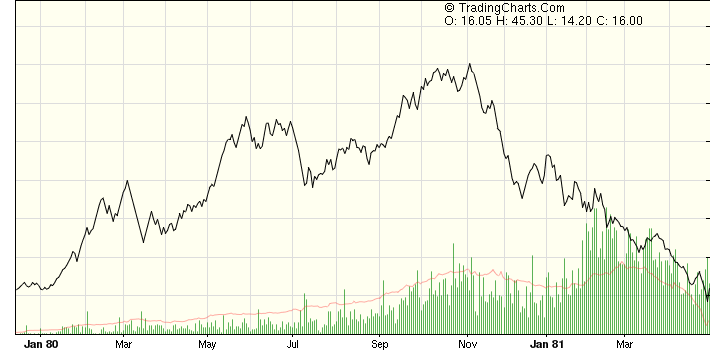 Das Hoch aus dem Jahr 1974 (60 Cents) wurde 1980 (45 Cents) zwar nicht erreicht, aber auch hier ist die Schnelligkeit der Preisbewegung (sowohl nach oben als auch nach unten) atemberaubend. Da kann man sowohl mit Longs als auch mit Shorts reich werden.