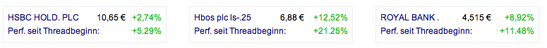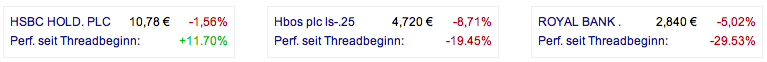 Entschuldigt, dieser Thread ist die einfachste Möglichkeit, den Performance-Vergleich dieser Banken ab dem heutigen Zeitpunkt zu beobachten. Zur Erklärung: HSBC und RBS liegen seit 2005 im Depot. Es hätte mehrere Ausstiegsmöglichkeiten gegeben, stattdessen bleiben sie liegen und vermehren sich sogar durch Dividenden-re-investments. Da die RBS mittelerweile zum Tiefstpreis zu haben wäre, überlege ich auch ein wenig aufzustocken, wo doch gerade mal wieder die Kanonen donnern...