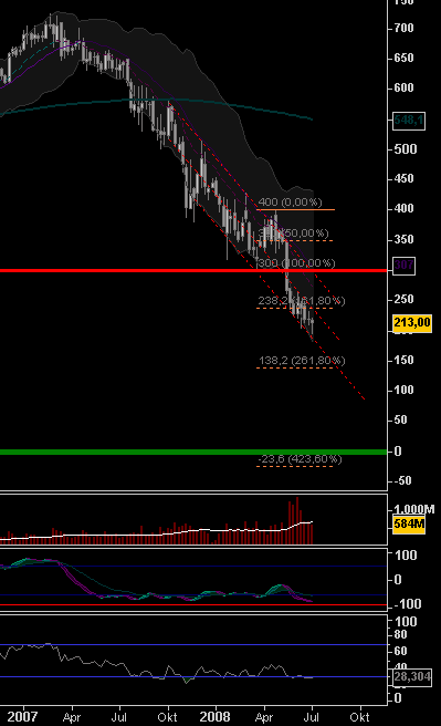 Im Ernst, das mittlere Bollinger im weekly liegt fast 50% über dem momentanen Kurs, die Indikatoren sind überverkauft bis fast auf die alltimelows - und dennoch kein Ende des Verfalls in Sicht. jungchen, Deine frühe Mahnung auch die RBS könne eine BearStearns werden war definitiv nicht verkehrt. Schade, dass Du die britischen Banken nicht geshortet hast, sonst wäre obiges Zitat schon wieder gerechtfertigt!