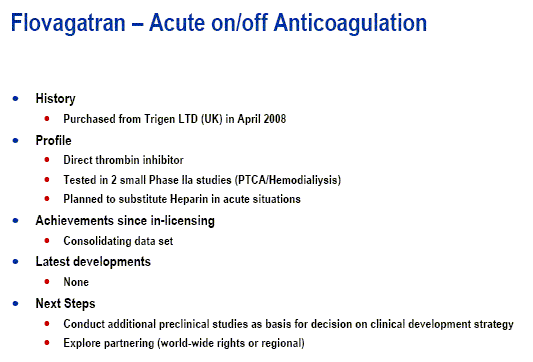 Letzer Kandidat in der klinischen Prüfung von PAION ist Flovagatran. Diese Substanz wurde erst vor kurzem einlizensiert und es gibt kaum Informationen. Deshalb gibts nur das Schaubild von der letzten PAION Präsentation