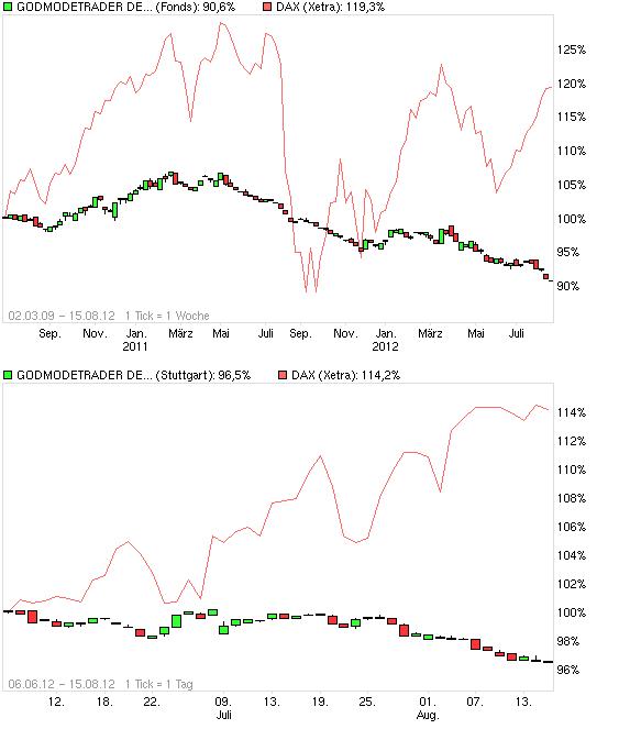 ... läuft allmählich aus. Der Chart in Toms Beitrag spricht Bände. Wenn bei insgesamt kräftig steigenden Märkten praktisch eine Null-Performance erreicht wird, kann das nur an einer grundlegend falschen Positionierung liegen. Diese ist m. E. gegeben durch die Übergewichtung des US-Marktes und Exoten aus dem Solar-, Rohstoff- und Biotech-Markt. Warum geht man überhaupt so weit ins Detail? Mit ein paar Calls oder Puts auf Indizes oder Sektoren hätte ein Godmode-Fonds - charttechnisch orientiert - doch eine vernünftige Performance erzielen müssen. - Die Zeichen stehen auf Ausstieg!