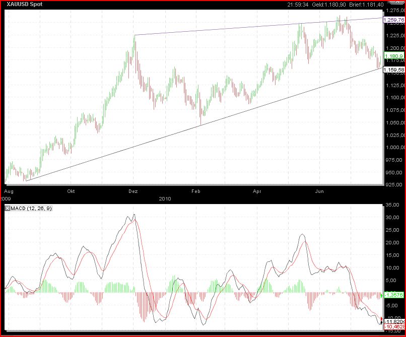 Ich glaube, dass niemand den Double Dip in den USA will....daher wird der Usd aufgeweicht und der Euro gestärkt, jedenfalls kurzfristig. Man merkt das an der Nachrichtenlage... Europa wird nur von Deutschland gezogen und das wird den Medien dann auch irgendwann auffallen. Spätestens wenn es den ersten Dämpfer im deutschen Export durch den hohen Euro gibt - vielleich im Sept.