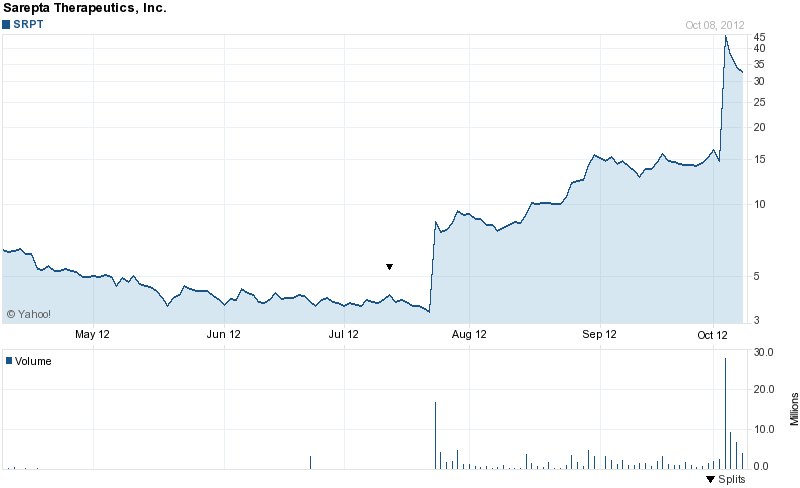 .... wie es bei Sarepta seit einigen monaten abgeht ? Hintergrund sind gute Phase-2 Ergebnisse einer muskelschwund Krankheit. Das Ganze nur mal als Vorgeschmack,wie es in Zukunft bei Stemcells auch laufen könnte,denn wir sind seit Kurzem im dry and wet AMD Bereich .....