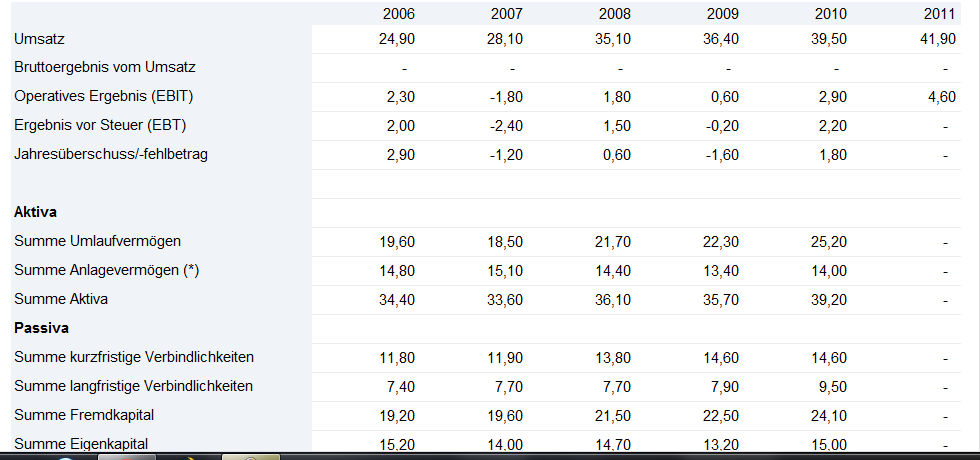 Nimmt man zum Vergleich jetzt die Ergenisse aus 2010 und vergleicht Sie mit denen aus 2006 so wird man feststellen das der Umsatz 2010 um 70% höher war und das EBIT sogar um 100% höher lag als 2006.