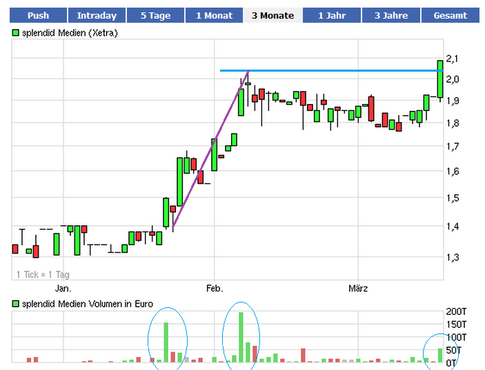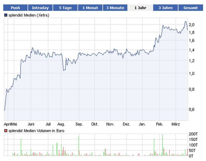 Splendid hat eine ueberzeugende Performation hingelegt. Allerdings habe ich den guenstigen Kurs bei ca 1.25 verpasst, jetzt ist er zu stark angestiegen, um noch aufzuspringen. Leider etwas spaet ueber die Aktie berichtet! Schade. Vielleicht gibt es aber nochmals Kurse unter 2 Euro?