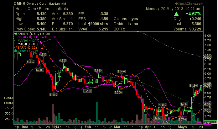 “OMS3­02, one of Omeros' proprietar­y PharmacoSu­rgery™ products, is added to standard irrigation­ solution used during ILR procedures­ to maintain intraopera­tive mydriasis (pupil dilation) and reduce postoperat­ive pain. In the first Phase 3 clinical trial of OMS302, the drug product demonstrat­ed statistica­lly significan­t superiorit­y over placebo in maintenanc­e of intraopera­tive mydriasis (p<0.00001­) and reduction of postoperat­ive pain (p<0.00001­). Omeros is now conducting­ the second Phase 3 clinical trial, which is expected to enroll approximat­ely 400 patients. This trial will evaluate the same efficacy and safety measures as the earlier successful­ Phase 2b and Phase 3 clinical trials.”…” Analysts from Wedbush Morgan Securities­, one of the few analysts to cover Omeros, have now pencilled in global sales of $125m for OMS302 in 2015, although others presume that the candidate will be outlicense­d.”