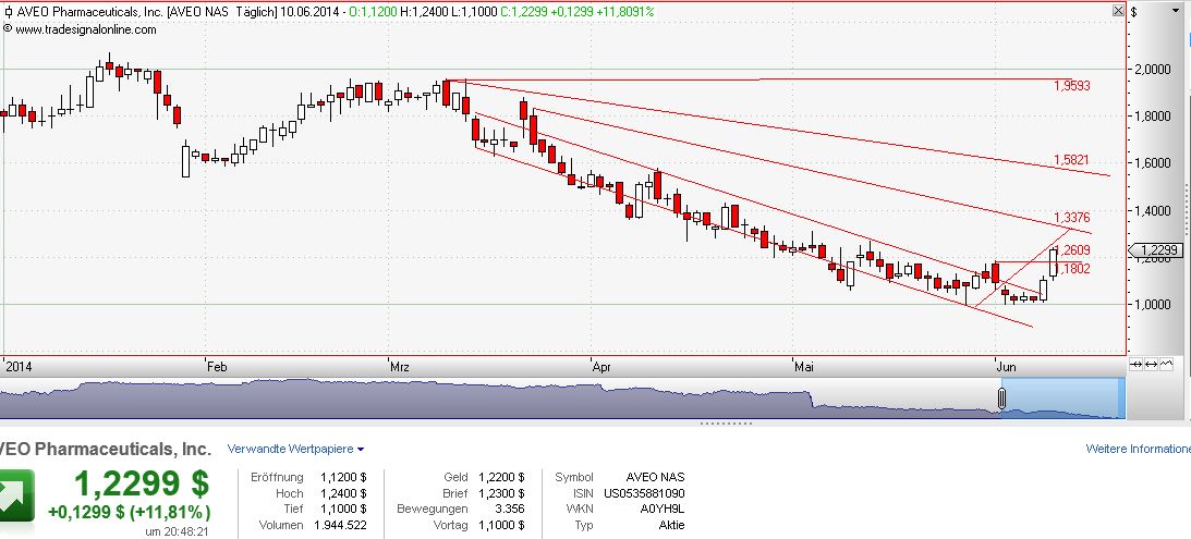 Aveo hat den abwärtstrend nach oben verlassen.und nimmt Kurs richtung 1,33 $ die muss dann noch weg gekauft werden ein überspringen ohne News bring nichts.Von da aus wäre dann platz bis 1,58 $ wo dann nochmal eine etwas größere Hürde steht.Fällt auch die gehts richtung 2,50 $ wobei bei 1,95 $ eine Hürde wieder über wunden werden muss