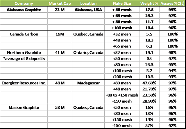 Zurück in the1940s, war der Bama-Mine ein voll funktionsfähiges Graphit-Mine, die eine elektrostatische Abscheider in der Mühlengebäude enthalten. "Sie wurde vor dem Ende des Zweiten Weltkriegs schloss jedoch die US Bureau of Mines abgetastet Graphit Ergebnisse der Mine und fand sie, einzigartig zu sein, da sie nicht nur registrierte den höchsten Anteil an Graphit (7,85% Cg), sondern enthielt auch 17% Jumbo Flocke, die beide unbekannt Vergleich zu anderen Graphitminen (Pallister & Thoenen, 1948) "waren. Laut einer aktuellen Mitteilung, mit einfachen Schwimm erzielte ALP eine Graphitkonzentrat, 54,7% großen Flocken (+80 Mesh), von denen 17,8% war Jumbo-Flocken (+48 Mesh) war. Reinheit reichte von 96,3% bis 98,5%. Wie man aus der Tabelle unten sehen können, werden die Preise auf Graphitflockengröße und Reinheit basiert. ALP eine große Prämie auf die Einlagen extrahiert sie ergeben.