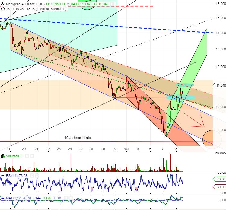 Wenn Medigene zum Wochenbeginn 11,00 Euro übersteigt, kann es weiter bergauf gehen.
