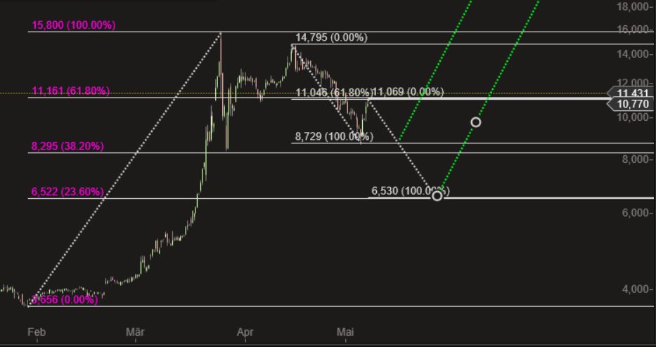 Wenn die 11,46 im laufenden Reversal nicht überschritten wird, droht die Fortsetzung der übergeordneten Korrektur als C-Welle mit dem Ziel 6,53. Erst ein Higher-High im Stundenchart gefolgt von einem Higher-Low führt zur Trendumkehr.
