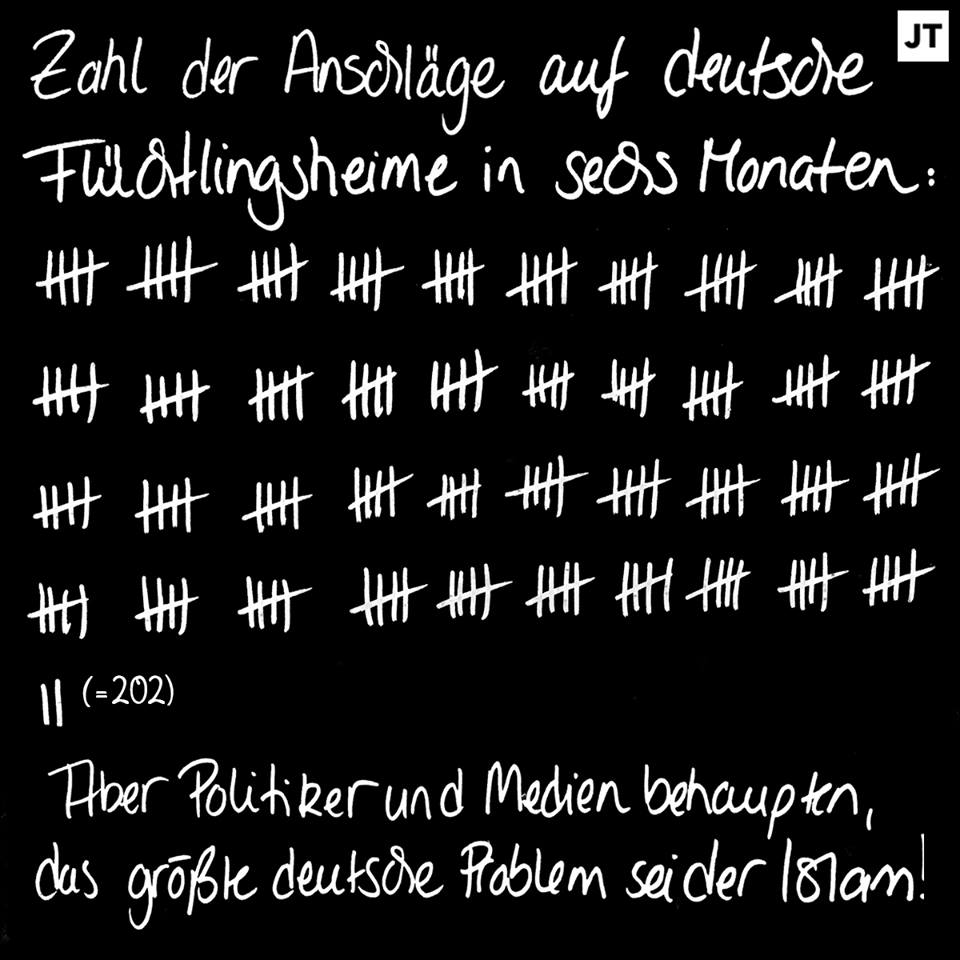 Im 1. Halbjahr 2015 gab es 202 Angriffe auf Flüchtlingsheime, davon mindestens 173 durch Rechte. Angriffe auf Menschen, die vor Tod, Unterdrückung und Hunger geflohen sind und alles verloren haben. Ein Flüchtlingsheim pro Tag! Das ist 16 Mal mehr als 2012!