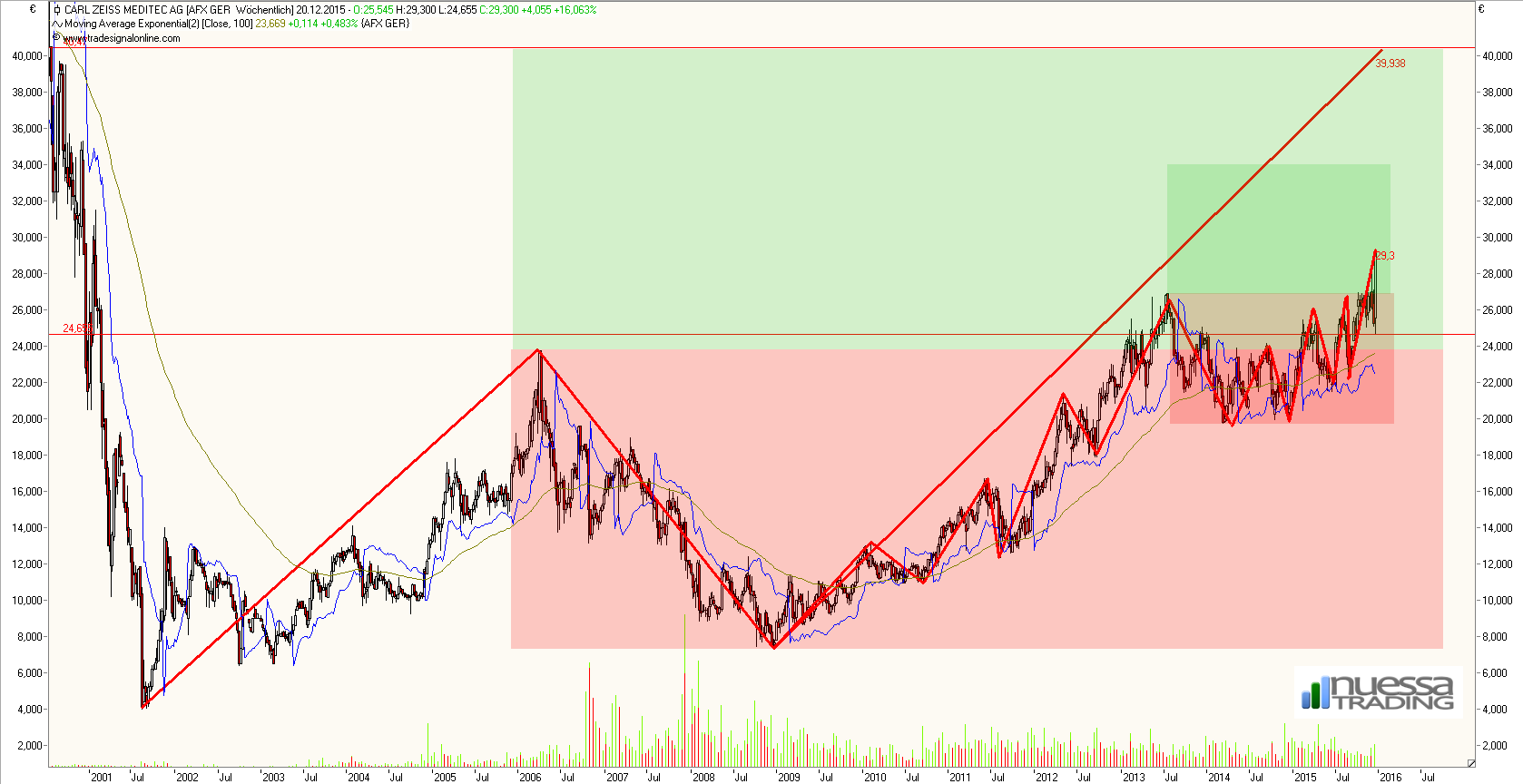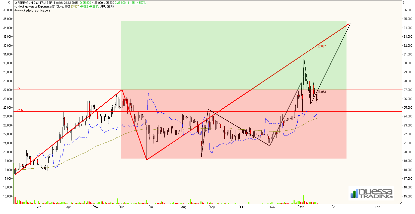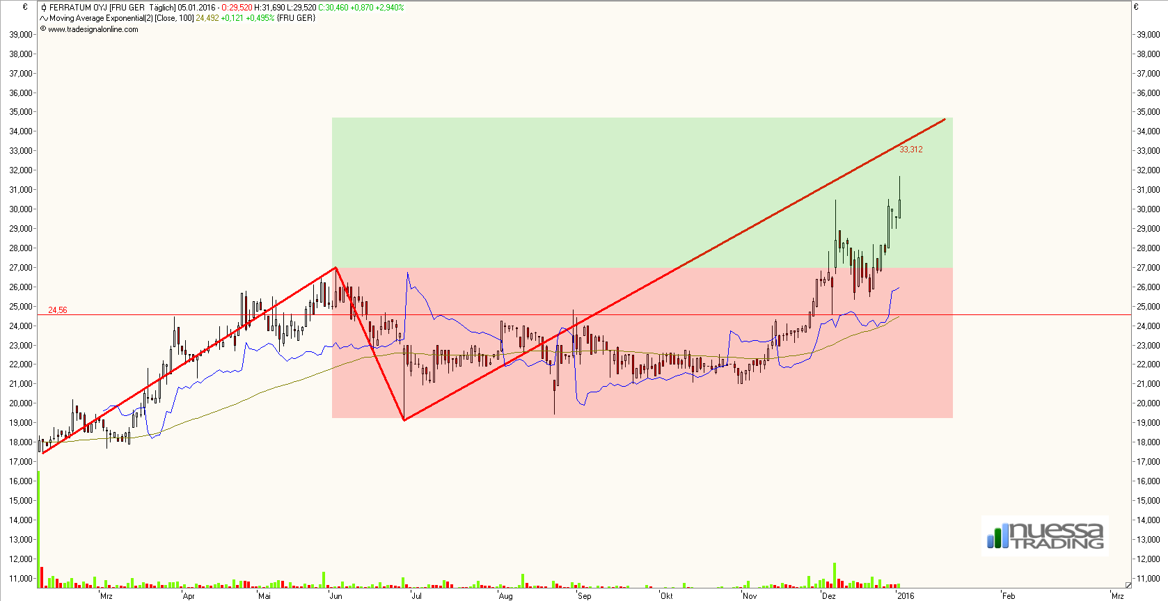Die Aktie befindet sich seit Emission in einem stabilen Aufwärtstrend. Seit Juli wurde die vorangegangene Bewegung korrigiert am 02.11.2015 habe ich eine Anfangsposition zu 31,94 € eröffnet, welche ich dann am 02.12.2015 um 20% vergrößert habe. Der StoppLoss ist von anfangs 26,40 € auf nunmehr 29,60 € nachgezogen worden. Als Zielzone für den Trade erwarte ich in etwa Kurse um 41 €. Sollte dies dann so auch eintreten ergibt sich ein C/R von anfangs 1,63 und mittlerweile ein C/R von 3,8. Was für einen Trendhandel unter Anbetracht der ehr hohen Trefferquote sehr gut ist.