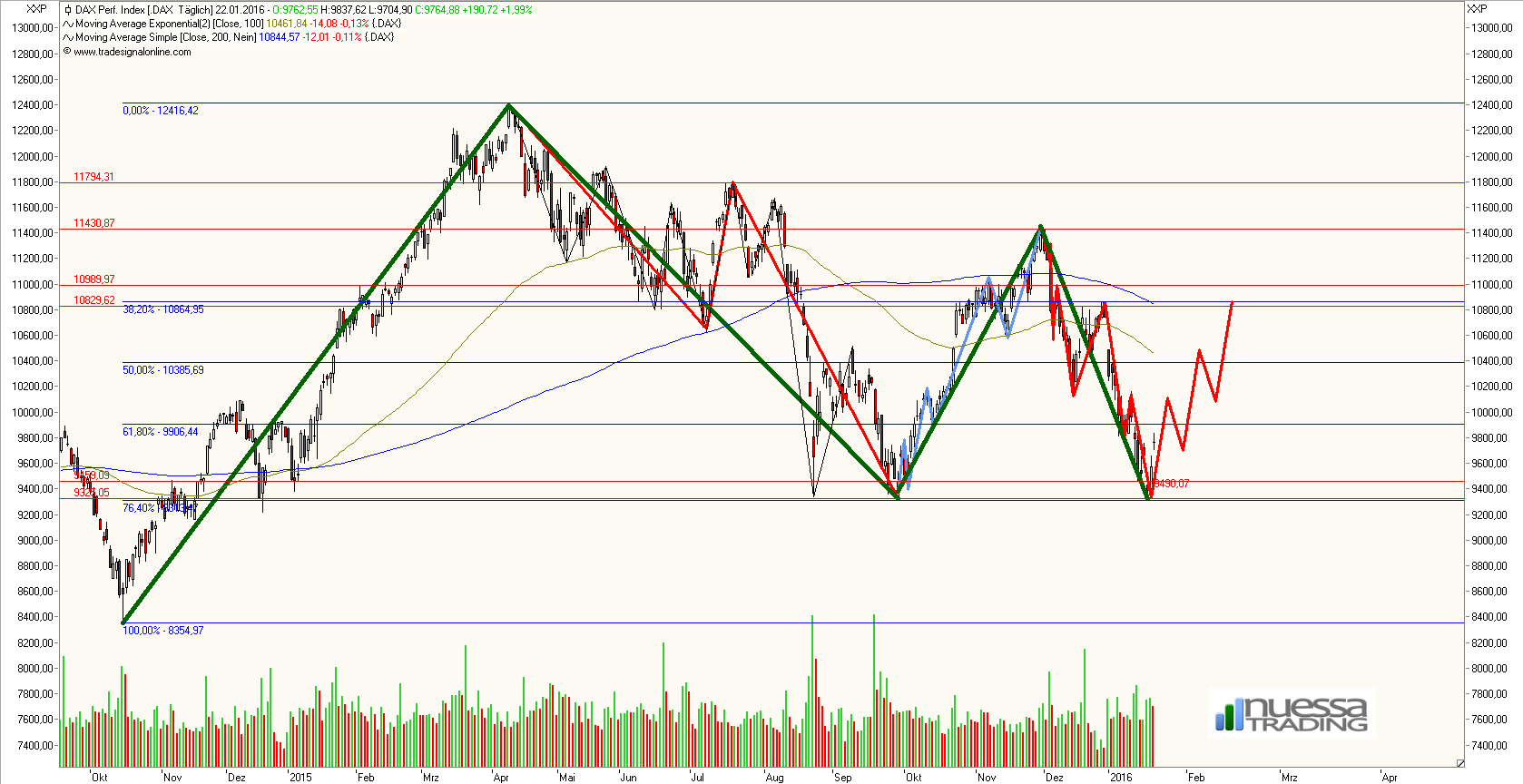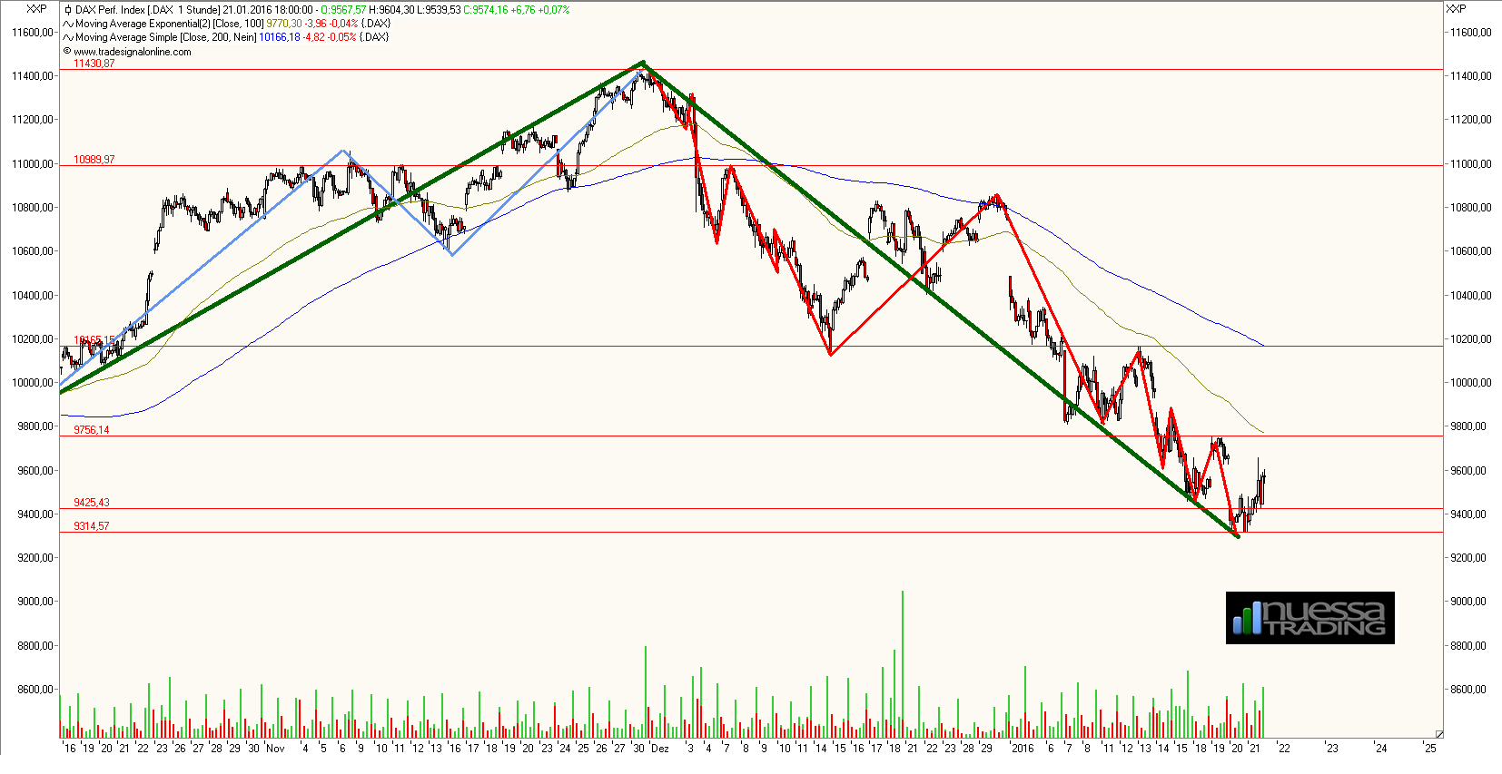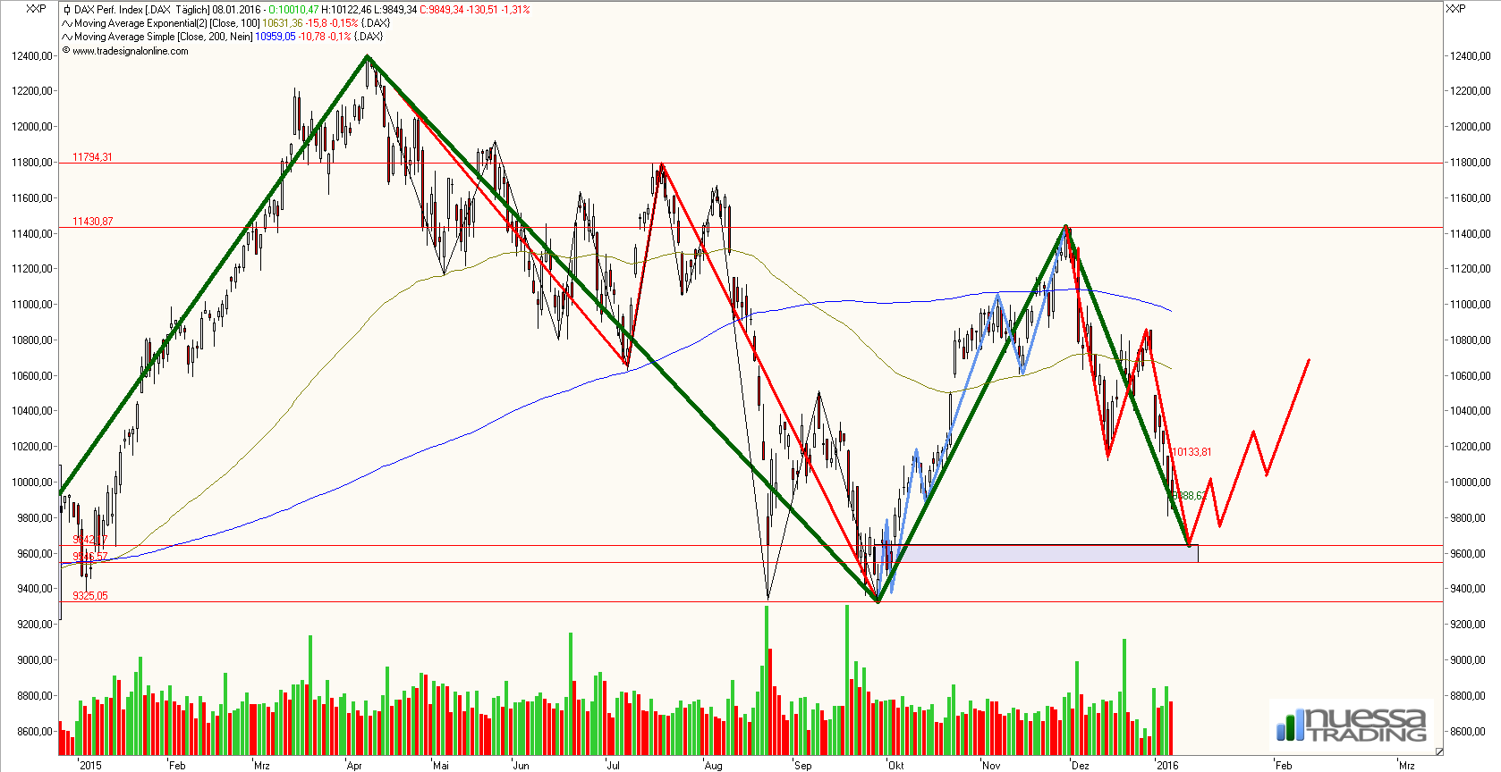 auch die vergangene Handelswoche wurde wieder mit Verlusten abgeschlossen. Mein Wikifolio schnitt deutlich schlechter ab als der Dax. Dies ist unter anderem den Umstand geschuldet, dass ich das Wikifolio massiv umgebaut habe. Ich habe die Positionen reduziert und die Gewichtung einzelne Werte, bei denen ich in der nächsten Zeit das beste Aufwärtspotenzial sehe deutlich erhöht. Nachfolgend werde ich auf die Positionen entsprechend eingehen. Aber zunächst schauen wir uns den Dax an, der mittlerweile an der in der letzten Woche erwähnten Marke 9700-9500 Punkte angekommen ist und diese in der Spitze bisher sogar um 40 Punkte unterbot. Wie in der letzten Woche angekündigt habe ich das Kursniveau zwischen 9550 – 9500 genutzt und bin mit nunmehr 5% meines Depots in einem Dax Long ETF mit dem Hebel 2 investiert. D.h. fällt der Dax um weitere 5% sinkt das ETF um 10% analog dazu wenn der Dax um 5% steigt, steigt meine Position um 10%. Wie auch schon letzte Woche erwähnt, liegt der damit verbundene StoppLoss bei einem Schlusskurs von unter 9250 Punkten im Dax.