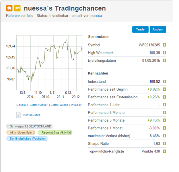Am 01.09.2015 wurde das Wikifolio nuessa´s Tradingchancen aufgelegt dies erwirtschaftete seit Auflage eine Rendite von 8,92%(Gebühr in Höhe von 0,95% p.A. bereits berücksichtigt)