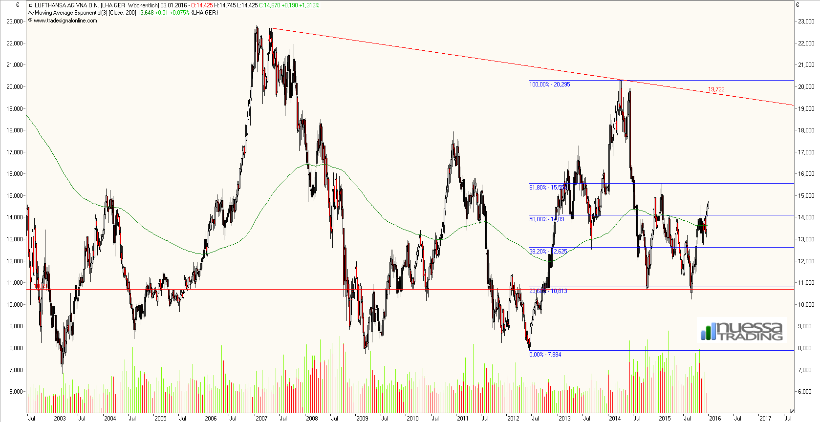 Sollten sich 2016 keine großen unerwarteten Veränderungen in der „Weltordnungsstruktur“ sowohl politisch als auch wirtschaftlich ergeben, rechne ich mit einem weiteren positiven Börsenjahr für den Dax. Ein Kurs bei um 14.070 Punkten halte ich in der seit nunmehr 4 Jahren laufenden Ralley für sehr wahrscheinlich erreichbar.