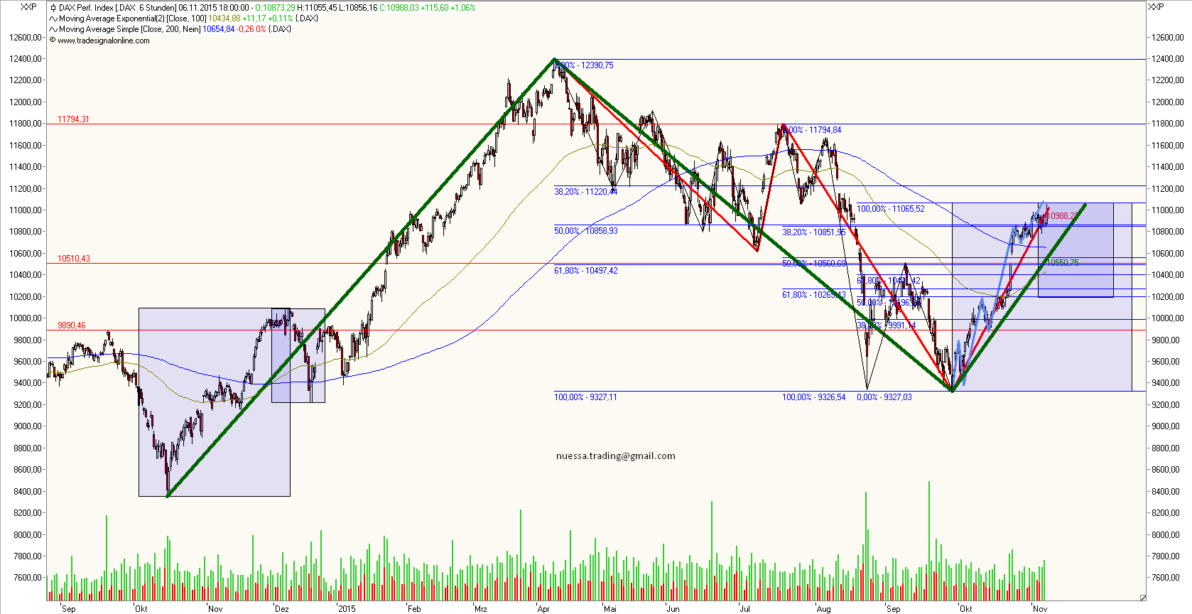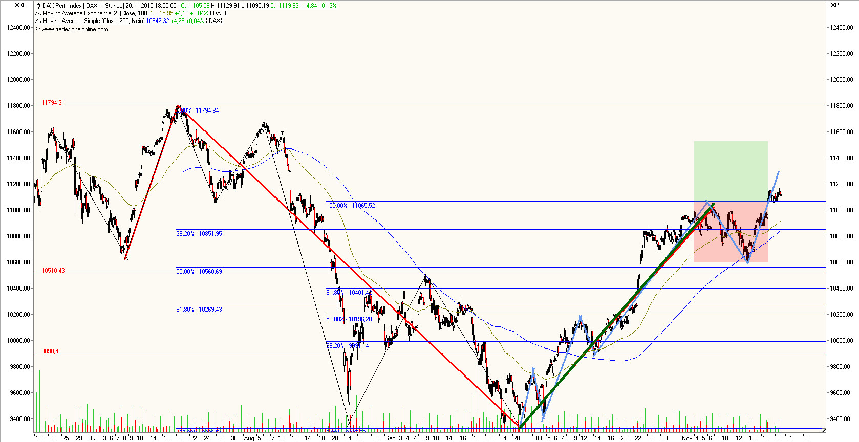 Im Verlauf hat sich um 10.600 Punkten bereits ein Boden gebildet, mit überschreiten des bisherigen Verlaufshoch bei ca. 11.065 Punkten signalisiert der Dax ein fortsetzen des untergeordneten Aufwärtstrends. Es ist mit weiteren Kursgewinnen bis zunächst 11.500 Punkten zu rechnen. Damit würde sich auch die Marke 11.800 nähern - dort wird entschieden, ob die Kräfte für eine Fortsetzung des übergeordneten Aufwärtstrends reichen oder nicht.