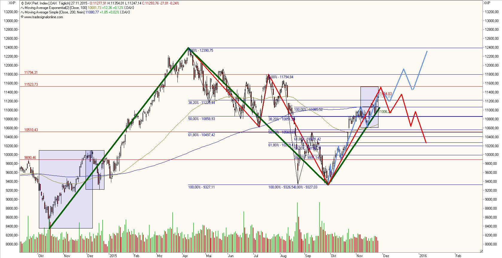 Alternativ versagt die Aufwärtsdynamik um 11500 - 11800 Punkten und es kommt zu einer weiteren Konsolidierung, die ohne weiteres bis in den Bereich von 10200 Punkten führen könnte. (mit Roten Linien im Chart dargestellt)
