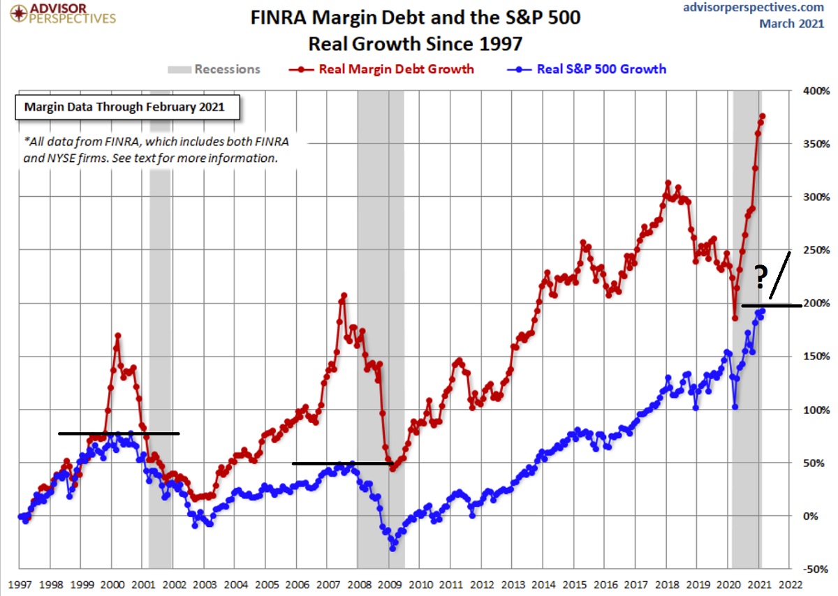 In den USA stieg die Margin Debt, also der zum Wertpapierkauf geliehene Betrag, auf über 800 Mrd. Dollar. Das ist ein Rekordwert. Während der Korrektur vor einem Jahr reduzierte sich die Margin Debt von 560 Mrd. auf 480 Mrd. Heute steht sie über 330 Mrd. höher.