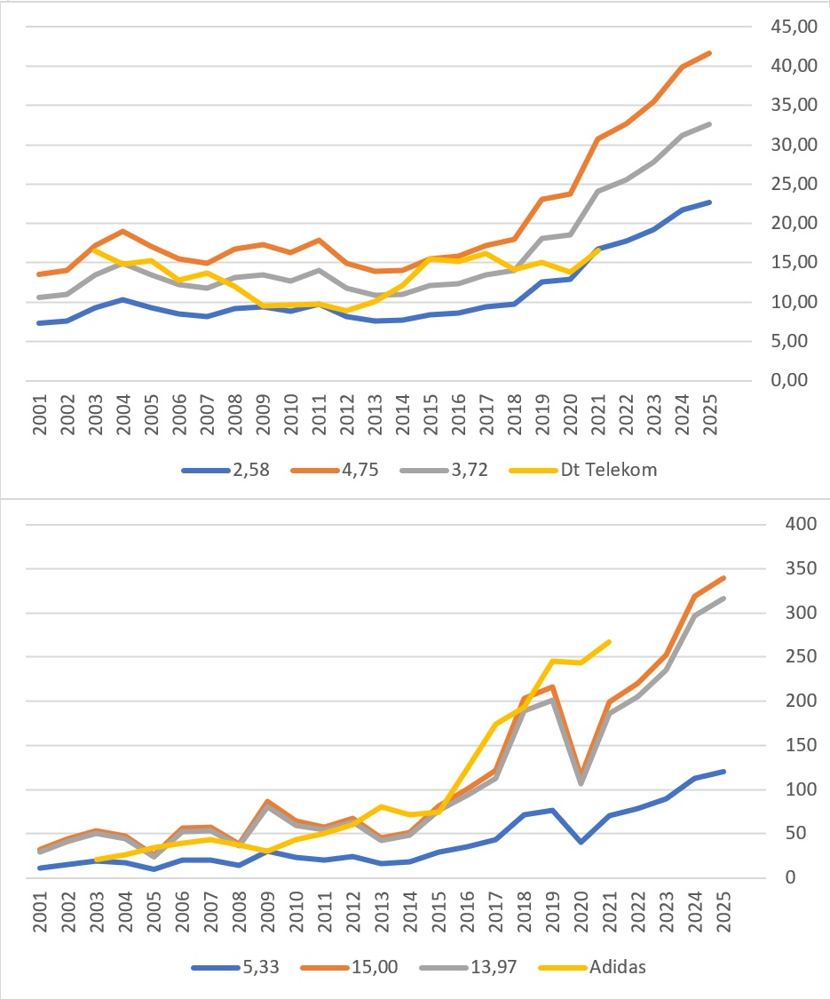 Bei Adidas dauert es bis 2023, bis man wieder zurück zu einem fairen OCF KGV von 15 gelangt ist. Der aktuelle Preis ist ziemlich hoch. In 2021 müsste Adidas bei 200 Euro stehen, das wäre fair. Man sieht, der Preis hat sich in der nähe eines 15er KGV aufgehalten, der mittelwert liegt bei 13,97.