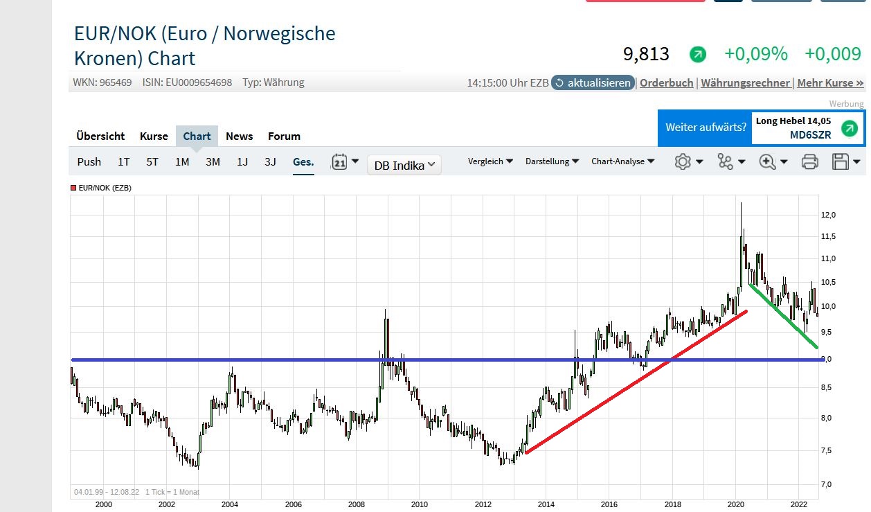 Bisher ist ja der € gegenüber den NOK gestiegen, somit könnte er nun wieder fallen = Währungsgewinn bei Rücktausch. Konnte man in diesen Jahr beim €/Franken ausnutzen.