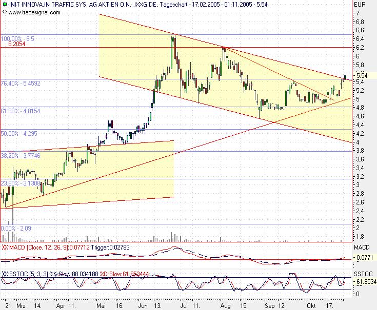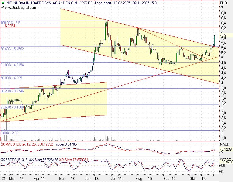 Diagnose/Prognose: Die INIT INNVOATION Aktie konsolidierte nach einem Hoch im Juli 2005 bei 6,50 Euro volatil seitwärts. In der letzten Woche durchbrach sie dieses Hoch mit einer langen weißen Kerze. Damit entstand ein wichtiges mittelfristiges Kaufsignal. Durch den kleinen Rücksetzer zu Beginn dieser Woche auf das alte Hoch wurde dieser Ausbruch bereits bestätigt. Solange die Aktie nun nicht per Schlusskurs unter 6,50 Euro zurückfällt, ist von einer bevorstehenden Aufwärtsbewegung bis 9,90 Euro auszugehen.