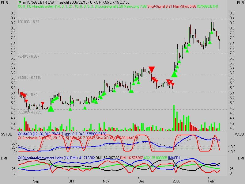Die INITI INNOVATION Aktie brach in der ersten Woche 2006 aus einer Seitwärtsbewegung zwischen 6,50 und 4,56 Euro nach oben aus. Danach stieg sie sofort auf ein Hoch bei 8,30 Euro. Von dort aus konsolidierte die Aktie in den letzten beiden Wochen. Bereits in dieser Woche zieht die Aktie wieder stark ab, obwohl sie die überkaufte Situation in den beiden letzten Wochen nicht abgebaut hat. Das mittelfristige Ziel liegt bei 9,90 Euro. Dieses Ziel steht noch aus und sollte relativ kurzfristig erreicht werden. Bei einem Wochenschlusskurs unter 6,50 Euro wäre dieses bullische Szenario hinfällig. Wahrscheinlich ist ein solcher Schlusskurs aber nicht.