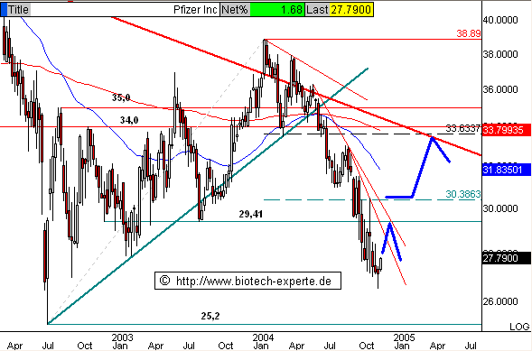 PFE ist in den letzten Monaten deutlich wegen Mercks Problemen mit Vioxx gefallen. Viele rechnen damit, dass nun auch PFE Probleme mit seinem COX-2-Schmerzmittel Celebrex bekommt. Ironischerweise hat Merck aber sein Vioxx aber gerade deshalb zurückgezogen, weil es bei einer Langzeitstudie eine deutlich höhere Mortalitätsrate aufwies als Celebrex.