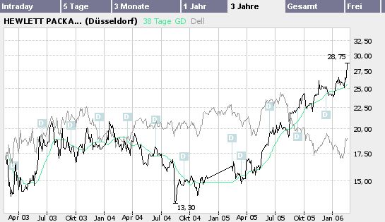 wäre der Kurs bei 26,25€ x 1,25 / 1,19 = 27,57€ . Nicht wesentlich höher, die Phantasie fehlt. Das Geld fliesst in HP, da man hofft HP könnte Dell weitere Marktanteile abnehmen. Aber wer kennt schon die Gedanken der Fonds oder Leerverkäufer etc.