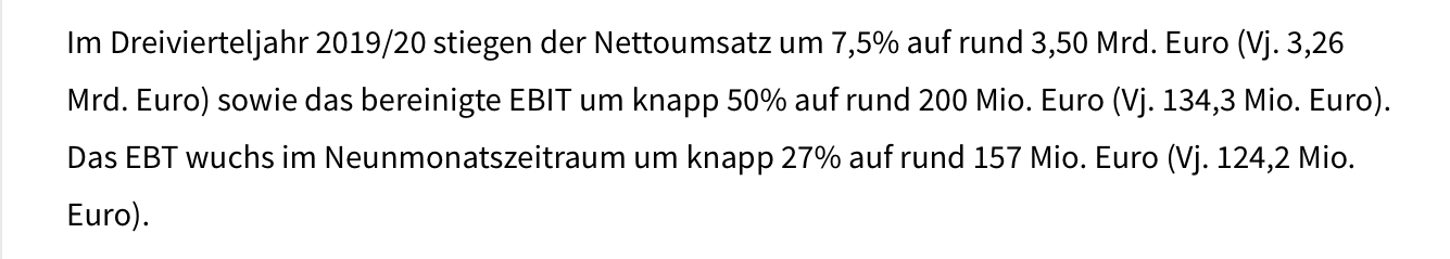 "Der Vorstand hat jedoch aufgrund der stark gegenläufigen operativen Ergebnissteigerungen im zweiten Quartal und ersten Halbjahr 2019/20 die Ertragsprognose für das Gesamtjahr 2019/20 moderat angehoben. Demnach wird nunmehr damit gerechnet, dass das bereinigte EBIT um mehr als 40% (zuvor: „mehr als 30%“) über dem Niveau des Geschäftsjahres 2018/19 (81,9 Mio. €) liegen wird. "