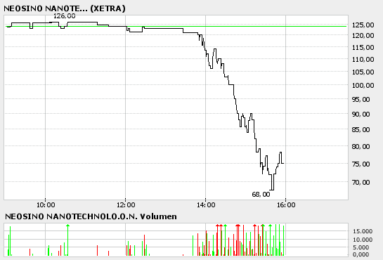 Börse-online heute :Auf einem Investorentreffen Mitte Januar in München verriet Neosino-Boss Edmund Krix den staunenden Anwesenden noch, wie sich die Einnahme der Neosino-Gesundheitspillen auf sein persönlichen Wohlbefinden ausgewirkt hätten: "Ich leiste mehr, bin ruhiger geworden und rege mich nicht mehr so schnell auf."Am heutigen Tag dürfte Krix einige Packungen seines gemahlenen Siliciums brauchen, um sich wieder zu erholen. Ein Bericht, der am heutigen Abend im ARD-Magazin Panorama ausgestrahlt werden soll, richtete nämlich ein Schlachtfest bei der Neosino-Aktie an. Im Tief rauschte der Kurs um 45 Prozent auf 68 Euro nach unten. Anschließend erholte sich das Papier jedoch wieder ein wenig und zog auf 82 Euro an. Im Vergleich zum gestrigen Schlusskurs von 124 Euro ist das aber noch immer ein ungewöhnliches Minus von fast 34 Prozent. Damit ist Krix, der noch rund 74 Prozent der Anteile hält, auf dem Papier um fast 42 Millionen Euro ärmer geworden.