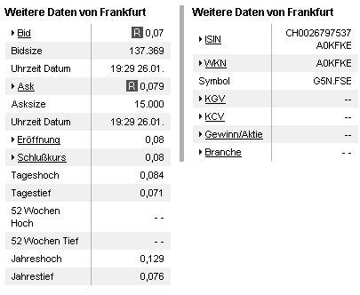 In der Tat hatte boerse.ARD.de im Juli 2005 erstmals über Ungereimtheiten bei diesem Unternehmen berichtet. Der Kurs brach damals drastisch ein. Von Kursen um die 11 Euro bis auf drei Euro. Mittlerweile ist die Aktie ein Penny-Stock und bei Notierungen von zwei bis vier Cent angelangt. Die Schuld der Medien?