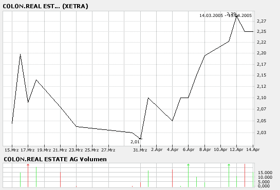 Als die COLON.REAL ESTATE AG 633800 im März 2005 auf den Markt kam, gab es im ersten Monat folgenden Kursverlauf (s.u. - nehme Kurs mal 4 wegen zwischenzeitlichem Split). Ich war damals daran interessiert, weil die Vivacon 604891 vom 1.1.05 bis 8.3.05 so hervorragend gelaufen war und ich den Zug verpasst hatte. Da ich vorher mit einem kleineren Wert aus der Solarbranche auf die Nase gefallen war, während Solarworld stieg und stieg..., hatte ich keine Lust auf weitere Verluste mit einem kleinen Wert aus der Immobranche, was sich im Nachhinein (man siehe den Wert von CRE heute!) als kapitaler Fehler herausgestellt hat.
