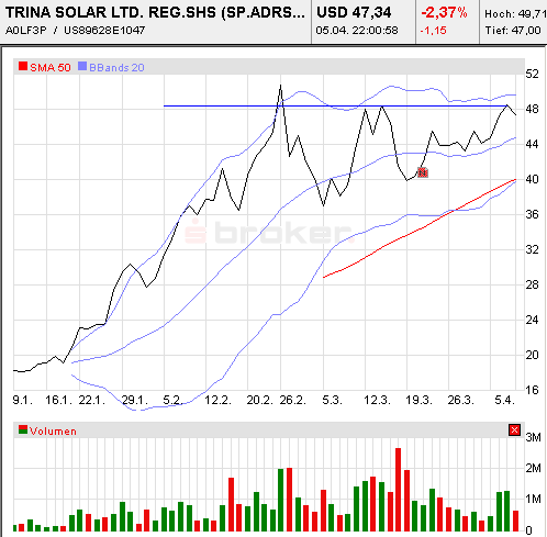 Auch in den USA wird regenerative Energie in Zukunft eine große Rolle spielen, Trina Solar ist zur Zeit günstig bewertet (niedriges KGV), die Kooperation mit Q-Cells, welche eine langfristige Lieferung von waferzellen zusichert, gibt der Aktie zukünftig ebenfalls Stabilität, ich rate dazu kleinere Aktienpositionen bis 32€ aufzubauen & auf 1 jahres- sicht für frühstens 50€ zu verkaufen! natürlich sind höhere gewinne in sicht für die,die long bleiben!