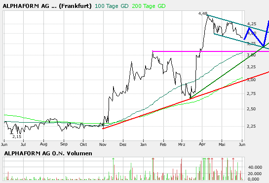 Wär aber ein Top-Einstiegsniveau, da man dann mit KGV von 8 und in Anbetracht der Tatsache von 2,4 € Cash pro Aktie ein super Schnäppchen wäre. Dazu hat Alphaform Übernahmemöglichkeiten in Osteuropa im Visier, die weiteres Wachstum bringen sollen.