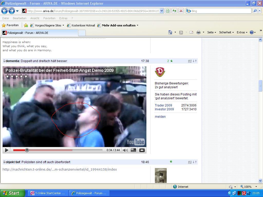 Prima, diese Kamerfunktion, die heute viele Mobiltelefone bieten! Ich denke, den prügelnden Beamten kann man jetzt sicherlich klar identifizieren und für sein Fehlverhalten zur Verantwortung ziehen! Ein besonderes Lob auch an denjenigen, der den Mut aufbrachte, dieses Video ins Netz zu stellen.